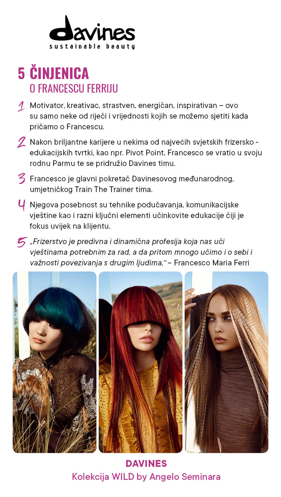Povodom njegova nastupa predstavljamo kratki intervju s Francescom Ferrijem! Uživajte u njegovoj frizerskoj filozofiji, a u SUBOTU, 6.4.2019. izbliza provjerite kako izgleda najnovija Davines kolekcija s potpisom inovativnog Angela Seminara!