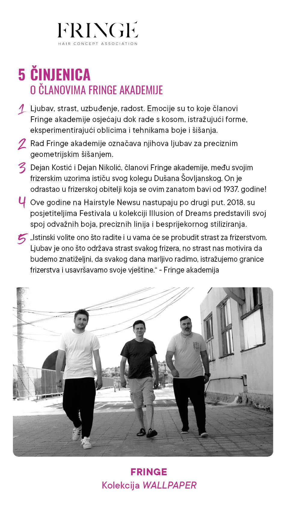 Povodom njihova nastupa predstavljamo kratki intervju s Fringe akademijom! Uživajte u njihovoj frizerskoj filozofiji, a u nedjelju 7.4.2019. pogledajte izbliza frizure s Fringe potpisom.