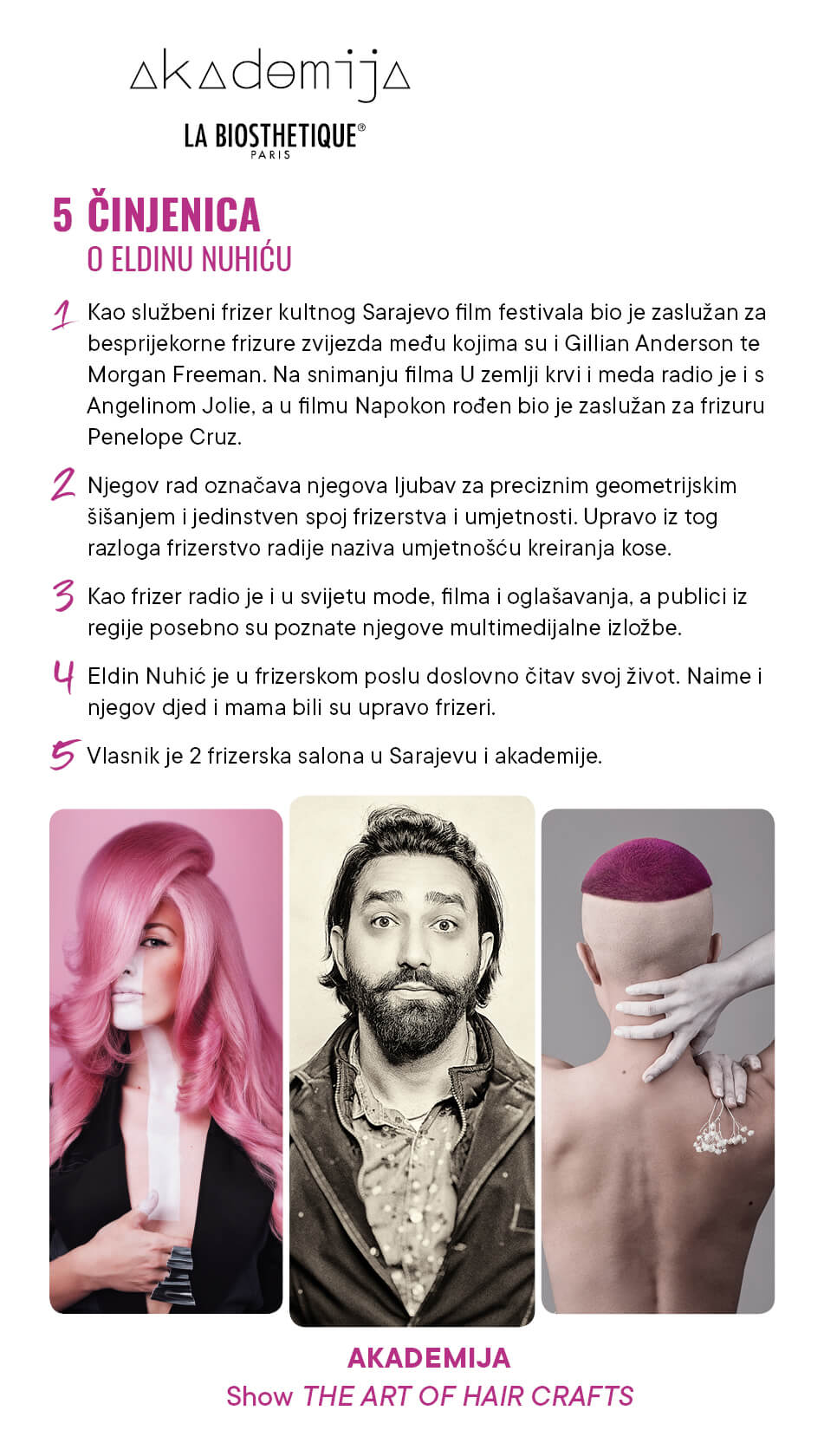 Eldin Nuhić je jedno od najmarkantnijih imena bosanskohercegovačke frizerske scene, a povodom njegovog nastupa predstavljamo kratki intervju s njim. Oduševite se njegovim jedinstvenim pogledom na frizerstvo, a u subotu, 6.7.2019. uživajte u njegovom spoju frizerskih vještina, tehnologije i umjetnosti.
