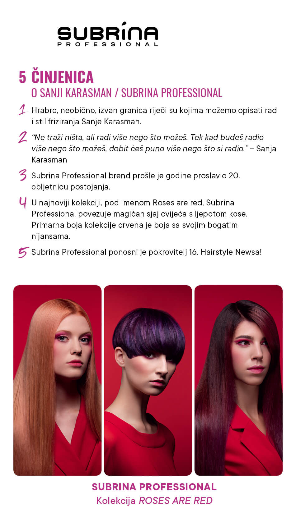 Povodom njihova nastupa na Hairstyle Newsu predstavljamo kratki intervju sa Sanjom Karasman, Subrina Professional kreativnom direktoricom. U nastavku doznajte što je s nama podijelila, a u nedjelju, 7.4.2019. upoznajte se s Roses are red kolekcijom koja dokazuje da je 2019. zaista godina boja!