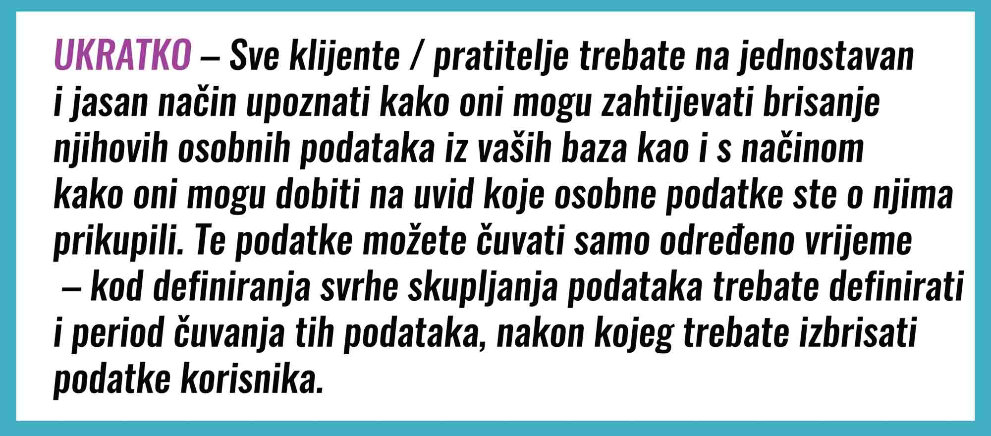 • Informacije se ne smiju čuvati duže nego što je potrebno za izvršavanje svrhe za koju je bila zatražena privola od korisnika