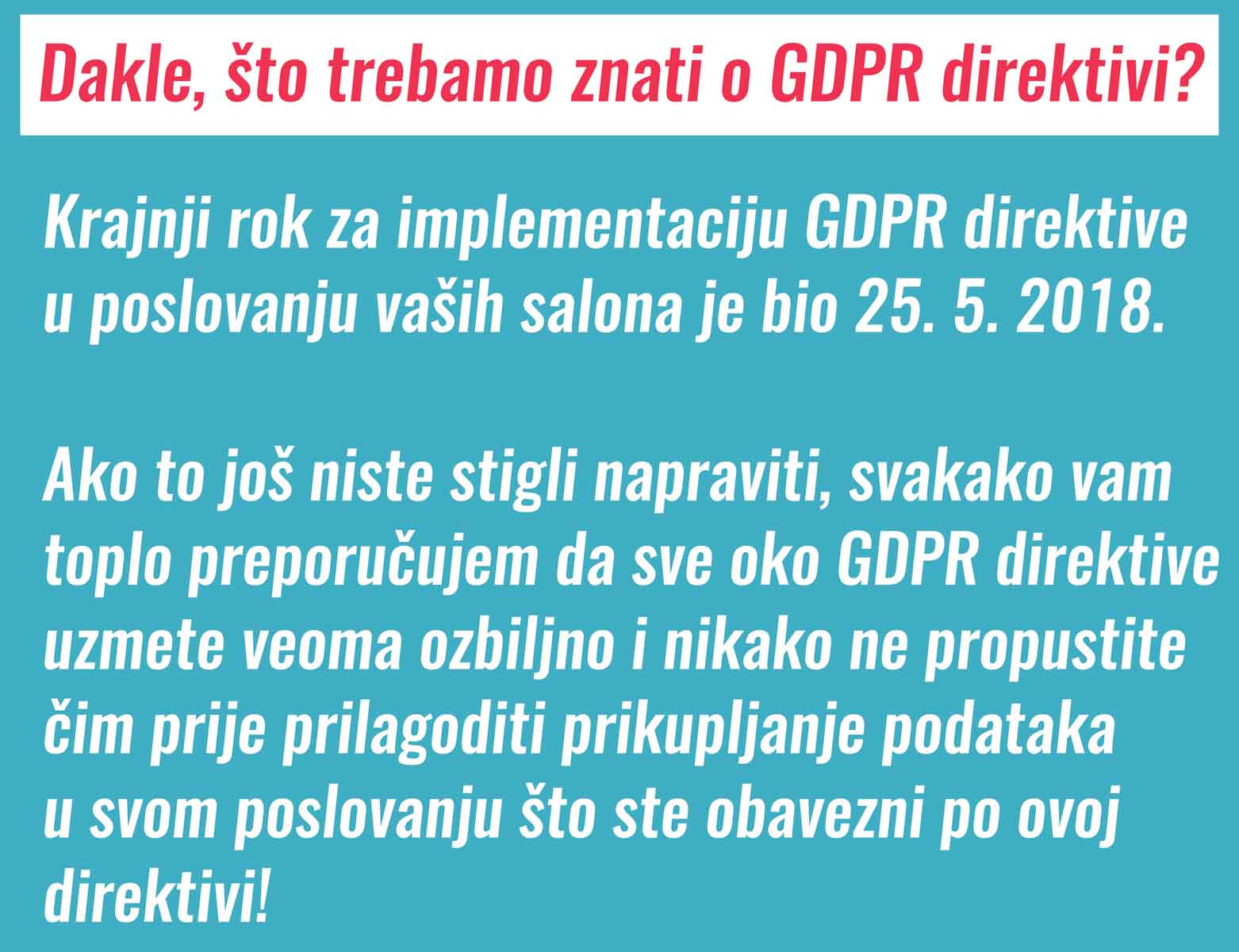 Prije nego počnem objašnjavati kako implementirati GDPR u poslovanju vaših salona, trebam istaknuti da ovo nije priručnik za GDPR. Pročitao sam GDPR direktivu, i sve što slijedi je moje mišljenje o toj velikoj promjeni, koja će iznimno utjecati na način skupljanja i obrađivanja osobnih podataka vaših klijenta.