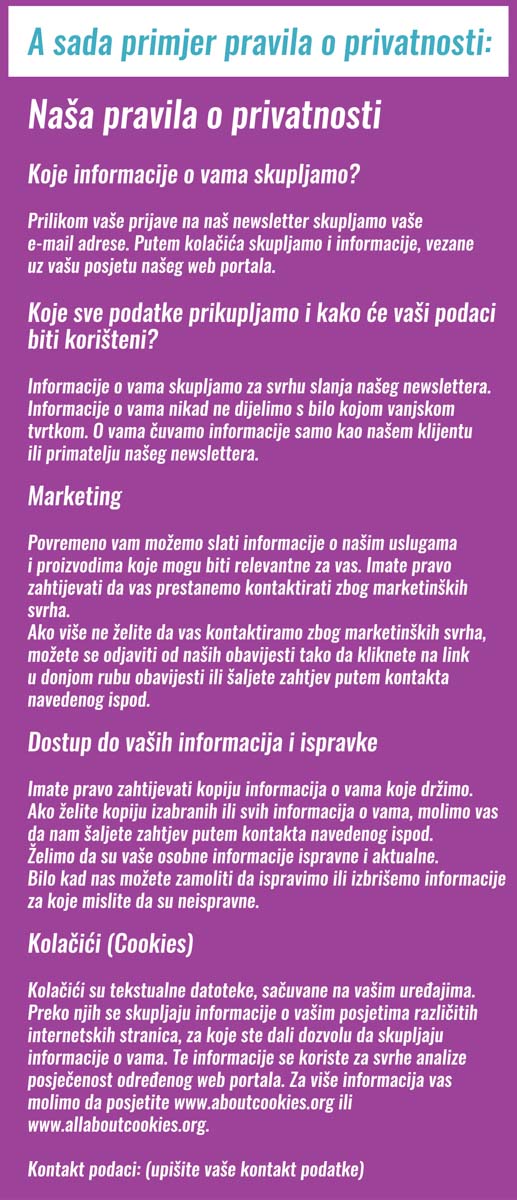 Prije nego što pogledamo primjer pravila o privatnosti, još jednom pogledajte primjer teksta i recite ako vidite nešto neuobičajeno. U primjeru da vas korisnik želi nastavljati pratiti, onda treba samo kliknuti na „Želim ostati na vašoj listi e-mail adresa“. U primjeru da ne želi, korisnik ne treba učiniti ništa, nego je to vaša obaveza da ga izbrišete – GDPR zahtijeva da izbrišete iz vaše liste sve e-mail adrese i podatke za koje niste dobili dozvolu za njihovo korištenje, za vaše definirane svrhe.