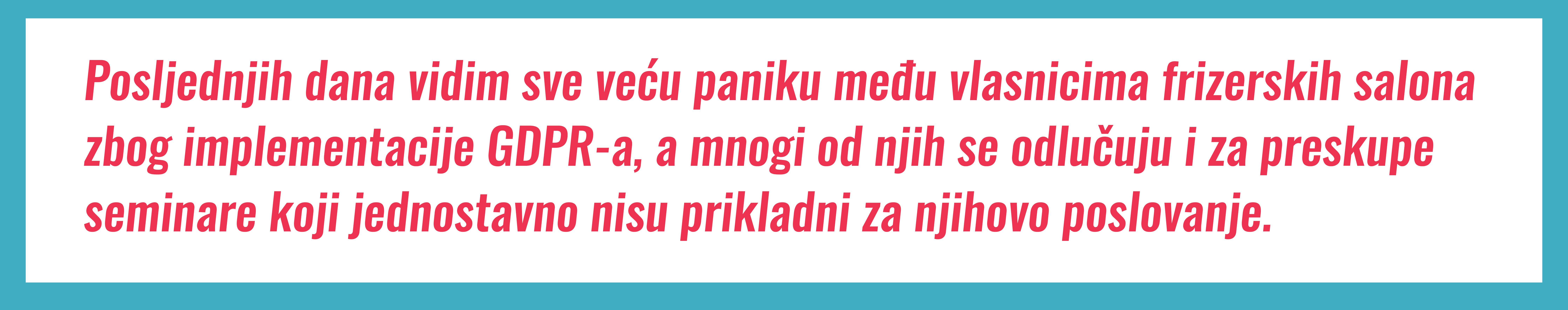 Istina je sljedeća – GDPR, u primjeru da ga implementirate savršeno, može pružati ogromne potencijale za unaprjeđenje vaših marketinških aktivnosti. Poznajem mnogo salona koji su skupili puno podataka, ali jednostavno ne znaju što s njima učiniti. GDPR nas motivira da ih napokon naučimo zaista koristiti, a to nam može otvoriti oči i za brojne načine informiranja naših klijenta sa posebnim ponudama i slično.