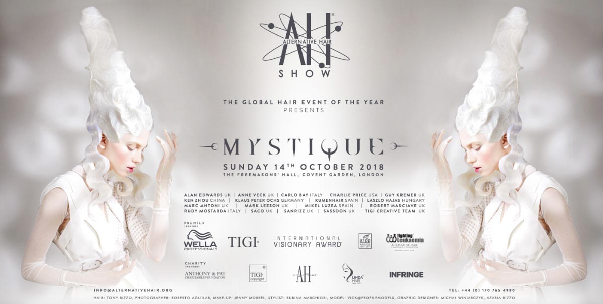 Show će se održati u nedjelju 14. 10. 2018. godine na novoj lokaciji u Covent Gardenu, u prestižnoj londonskoj Freemasons’ Hall dvorani. Kao uvijek, na velikoj pozornici možete pogledati nastupe najboljih svjetskih frizerskih timova koji će predstaviti svoje interpretacije ovogodišnje teme – Mystique. Alternative Hair Show i ove godine ima humanitarni karakter jer su prihod i donacije namijenjeni istraživanju leukemije.