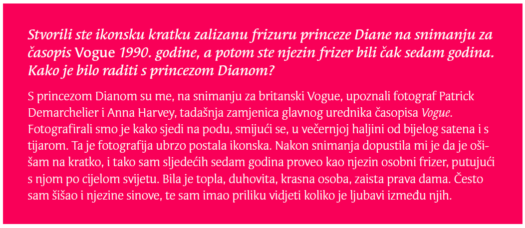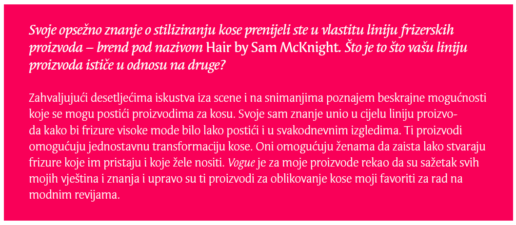 Sam McKnight, vizionar frizerskoga svijeta, jedan je od prvih frizera koji su na mapu frizerstva postavili zvanje „session stylist“. Radio je sa svim utjecajnim urednicima nekih od najvažnijih modnih časopisa na svijetu i legendarnim fotografima. Zajedno su napravili pravu revoluciju u svijetu modne fotografije, a mnogi modeli za svoje legendarne izglede mogu zahvaliti upravo njemu. Miljenik modnog svijeta već više od četiri desetljeća pomiče granice frizerskog, a i modnog svijeta te zauzima ključnu ulogu u stvaranju trendova diljem svijeta. Svi se sjećamo legendarne frizure koju je stvorio za britansku princezu Dianu. „Ona je bila skromna i iznimno topla osoba. Uvijek sam se ugodno osjećao u njezinu društvu i uvijek se trudila nasmijati nas svojim šalama!”